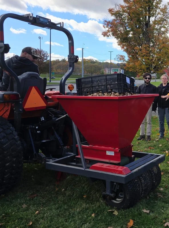 Dr. William Miller Cornell University Professor of Horticulture and Research Director of Horticulture Section, School of Integrative Plant Science, has guided this daffodil project –one of many in his career of naturalizing bulbs – using a unique planting machine given to Cornell’s College of Agriculture by the Dutch bulb company, A. Geerlings. The planter slices open the sod, drops in the bulbs, and then replaces the sod. 8,000 bulbs were planted in 11 minutes -weeks ahead of what could have been done by hand!